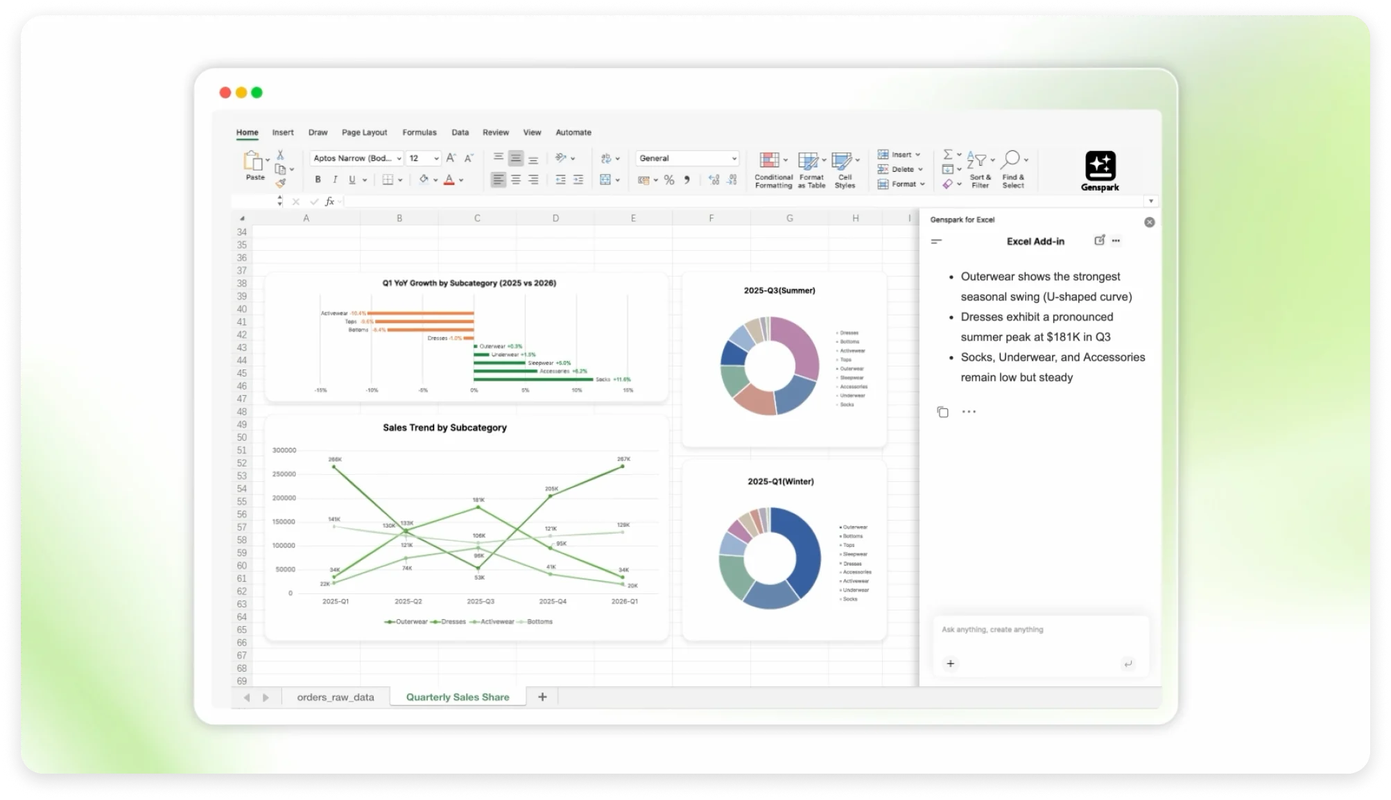 Genspark for Excel is an AI assistant that lives inside Microsoft Excel, handling formulas, charts, data analysis, and even web research, all through plain English prompts.